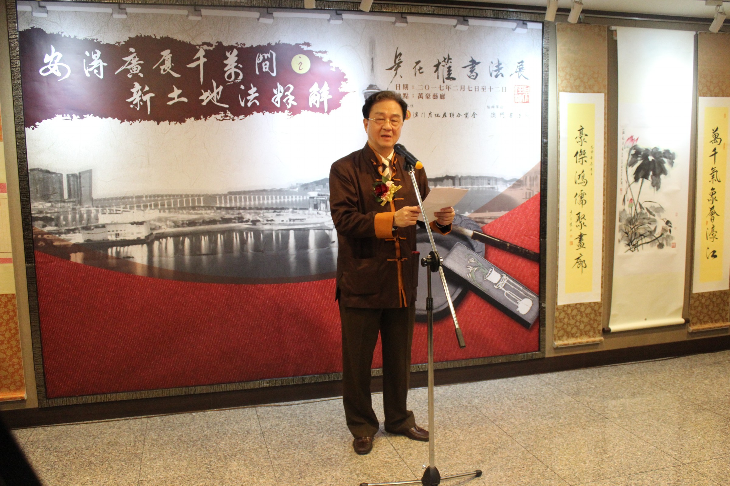 澳門房地產聯合商會會長吳在權致詞指出,書法作為中國十大國粹之首,澳門更加是中西文化薈萃之地,因此,希望透過舉辦以新土地法問題為內容之書法展,一方面有助於弘揚國粹,促進中國傳統文化之傳承與發展;另一方面,也是響應習近平主席在二〇一五年十月十五日在文藝工作座談會的講話精神,讓文藝根植現實生活,反映社會現實及人民關切,將土地法問題作出釋解並梳理,以尋求解決之道,更利特區“一國兩制”成功貫徹,如唐代詩人杜甫詩所言:安得廣廈千萬間,大庇天下寒士俱歡顏,風雨不動安如山,使得民生安居樂業!